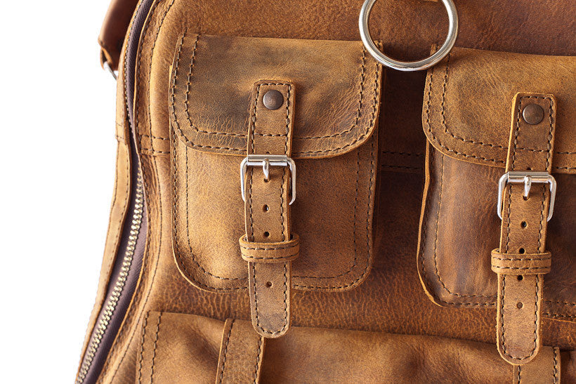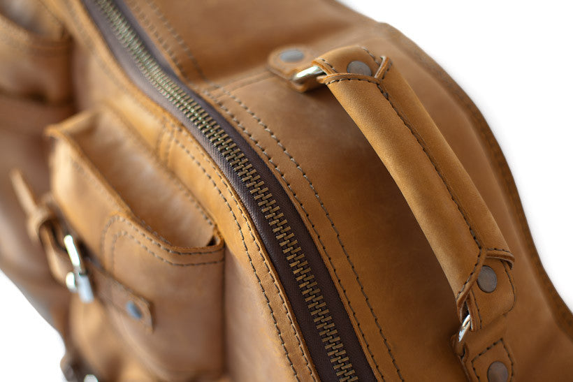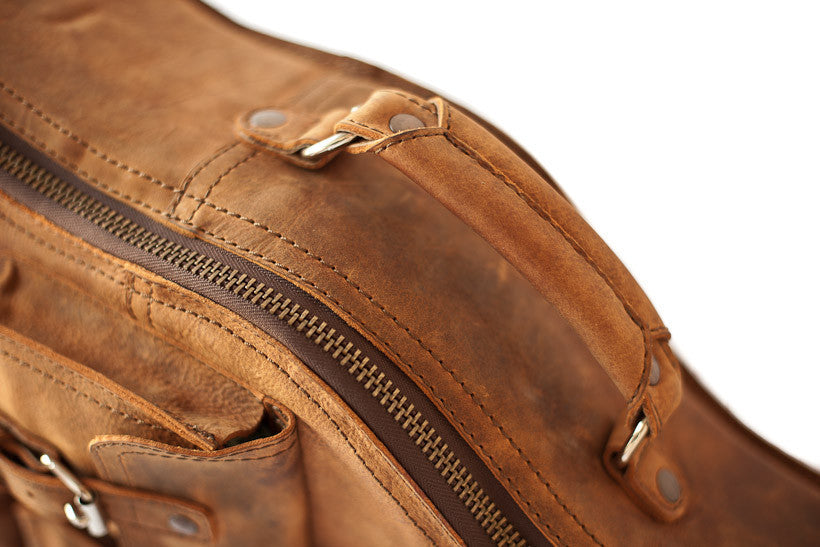 100% Full Grain Leather Lifetime Warranty Sewn with marine grade threading 1" High density foam padding Strap that works as a backpack or shoulder strap Stainless steel hardware